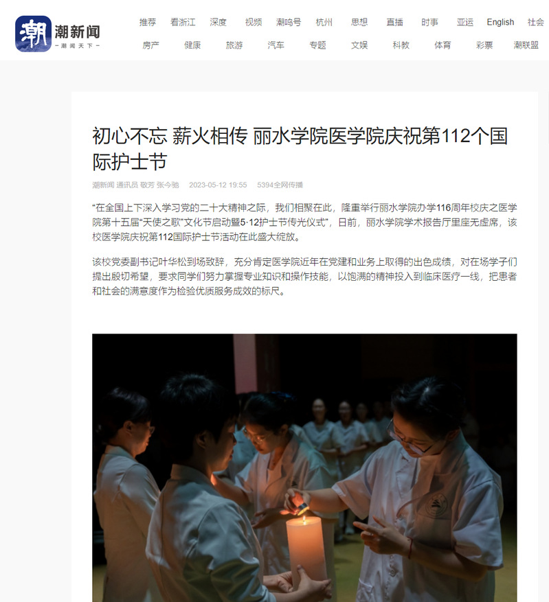 5月12日,潮新闻客户端报道了我校医学院庆祝第112个国际护士节的活动。