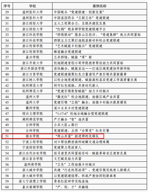 近日,中共浙江省委教育工委发布《关于公布全省高校校企地党建联建典型案例的通知》,我校中国(丽水)两山学院直属支部报送的“‘两山共富’挺进师的先锋队”校地党建联建案例入选。