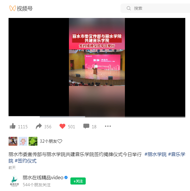 5月19日,丽水在线视频号刊发了丽水市委宣传部与我校共建音乐学院签约揭牌仪式举行的内容。