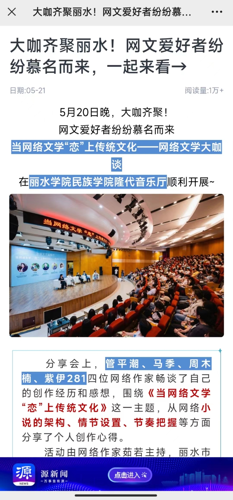 5月22日,源新闻客户端刊发了我校民族学院举办“‘文学梦源丽水’丽水市首届文学季之走进大学校园当网络文学恋上传统文化”——网络文学大咖讲座的消息。