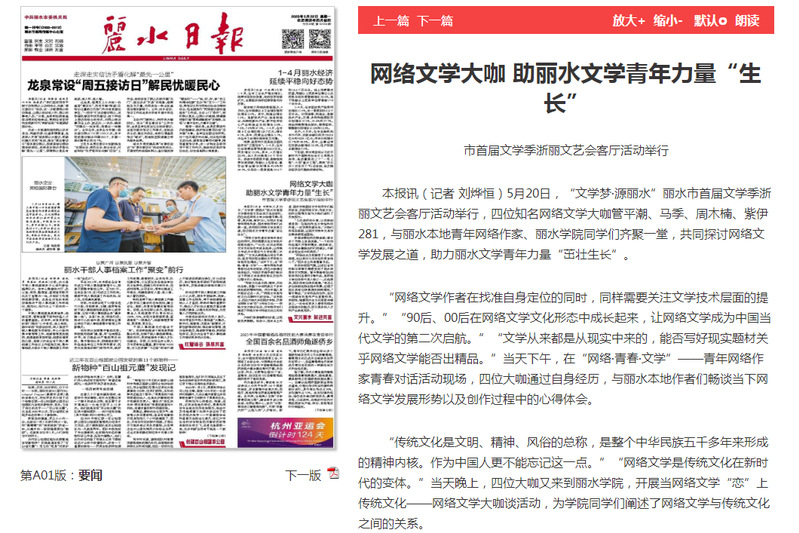 5月22日,丽水日报刊发了“文学梦·源丽水”丽水市首届文学季“当网络文学‘恋'上传统文化——网络文学大咖谈”活动在我校举行的消息。