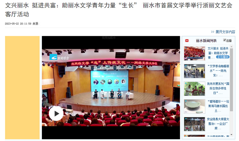 5月22日,丽水电视台新闻综合频道播出了“文学梦·源丽水”丽水市首届文学季“当网络文学‘恋'上传统文化——网络文学大咖谈”活动在我校举行的消息。