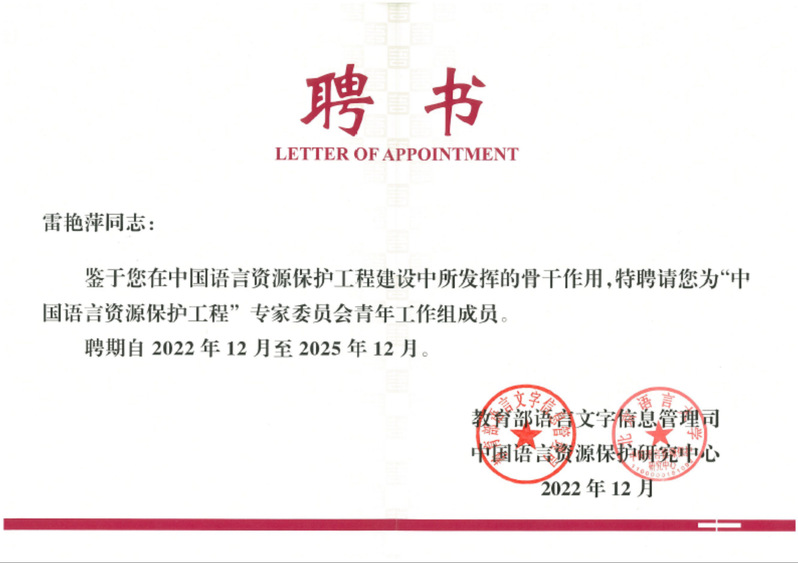 近日,我校雷艳萍老师被教育部语信司和中国语言资源保护中心聘为“中国语言资源保护工程”专家委员会青年工作组成员,并受邀参加5月15-16日在广西南宁举办的中国语言资源保护工程专家委员会第一次工作会议、中国语言资源保护工程2023年度工作会议。