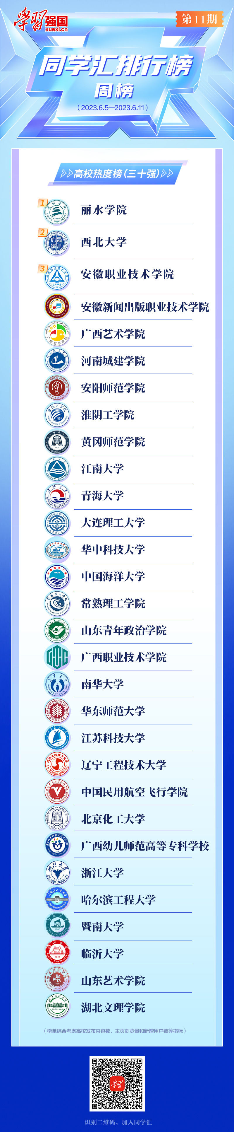 6月16日,“学习强国”学习平台公布了同学汇排行榜全国高校热度榜第11期(2023.6.5-6.11),我校排名第一,荣登榜首。