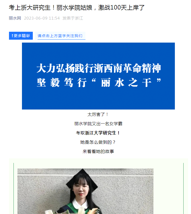 6月9日,丽水网微信公众号刊发了我校学生姚姚考上浙江大学研究生的消息。