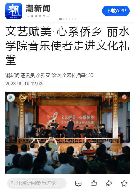 6月19日,潮新闻客户端刊发了我校音乐学院音乐使者将高雅文化带进青田乡村大礼堂的消息。