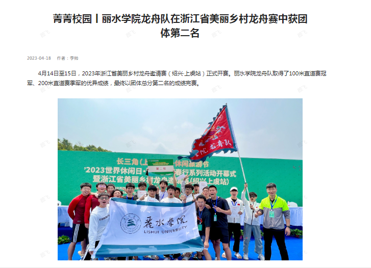 4月18日,学习强国丽水学习平台刊发了我校龙舟队在浙江省美丽乡村龙舟赛中获团体第二名的消息。