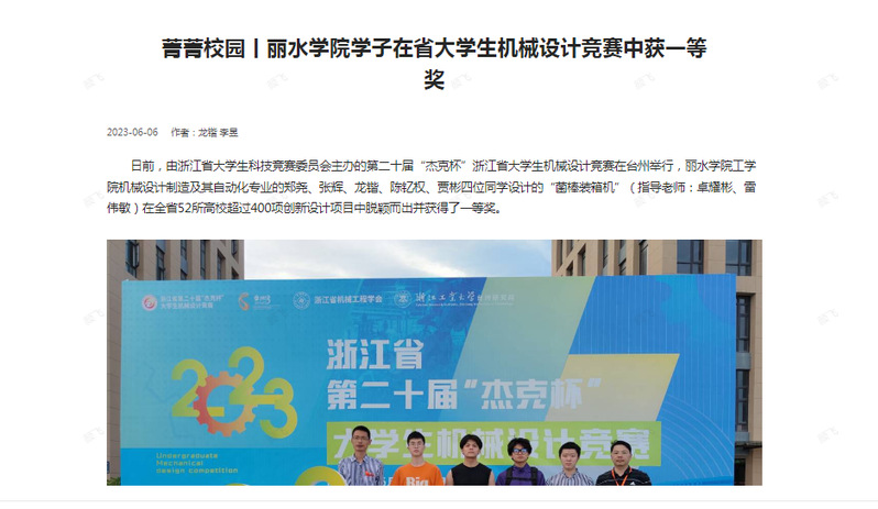 6月6日,学习强国丽水学习平台刊发了我校工学院机械设计制造及其自动化专业的郑尧、张辉、龙锴、陈钇权、贾彬同学设计的“菌棒装箱机”(指导老师:卓耀彬、雷伟敏)在浙江省大学生科技竞赛委员会主办的第二十届“杰克杯”浙江省大学生机械设计竞赛中获得一等奖的消息。