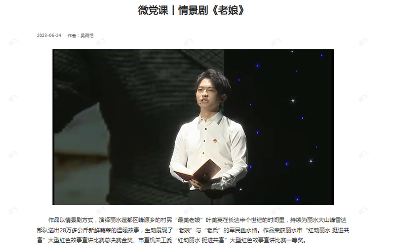 6月24日,学习强国丽水学习平台刊发了由我校吴雨恬老师指导的示范性微党课作品《老娘》。