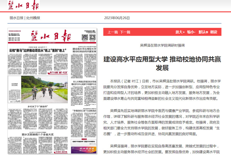 6月26日,丽水日报刊发了市长吴舜泽在丽水学院调研时强调:建设高水平应用型大学 推动校地协同共赢发展的消息。
