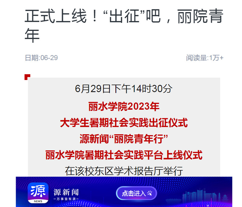 6月29日,源新闻客户端刊发了我校2023大学生暑期社会实践出征,源新闻“丽院青年行”暑期社会实践平台上线仪式的消息。