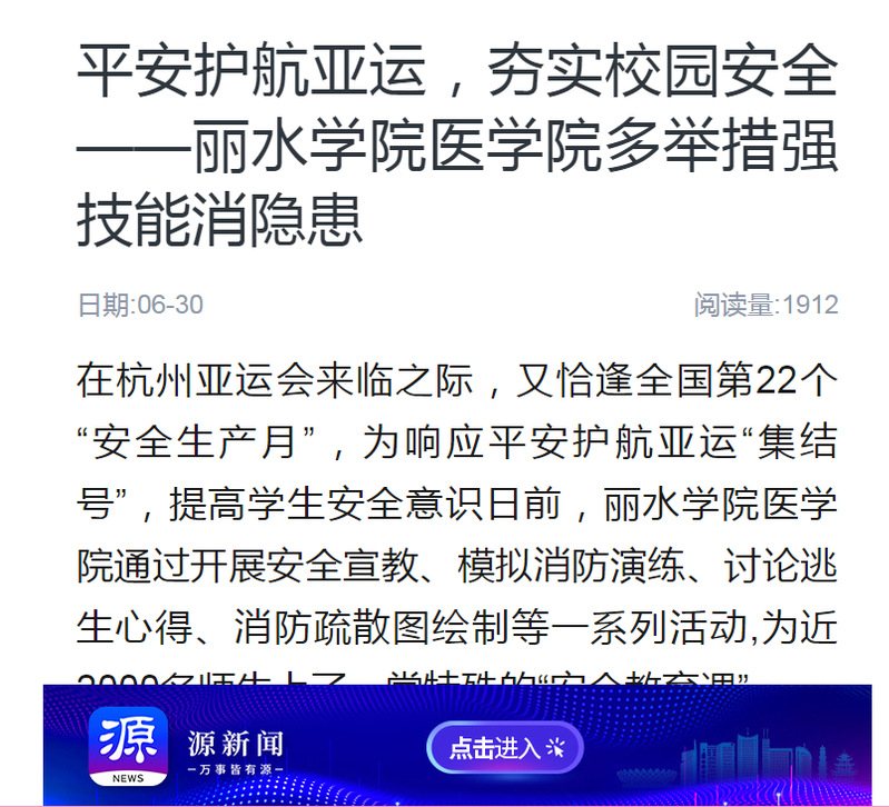 6月30日,源新闻平台客户端发布了丽水学院医学院多举措并举、开展多样活动为师生强化安全教育的消息。