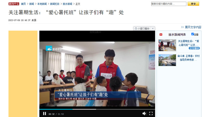 7月9日,丽水电视台新闻综合频道播出我校暑期社会实践团队为北郭桥社区孩子开办“爱心暑托班”的消息。