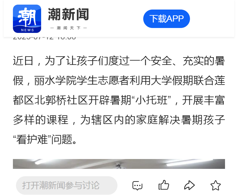 7月12日,潮新闻客户端刊发了我校暑期社会实践团队为北郭桥社区孩子开办“爱心暑托班”的消息。