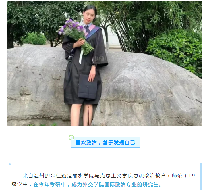 7月8日,丽水网刊发我校马克思主义学院思想政治教育(师范)19级学生余佳颖是考取外交学院国际政治专业的研究生的消息。