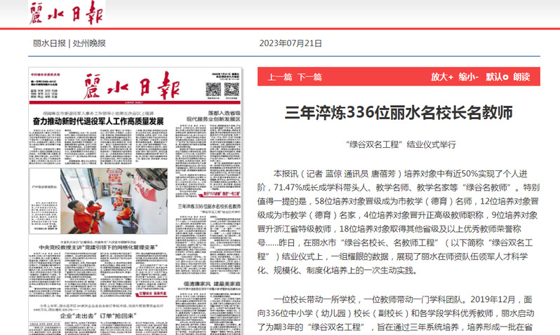 7月21日,丽水日报头版刊发了我校举行“绿谷双名工程”结业仪式的消息。