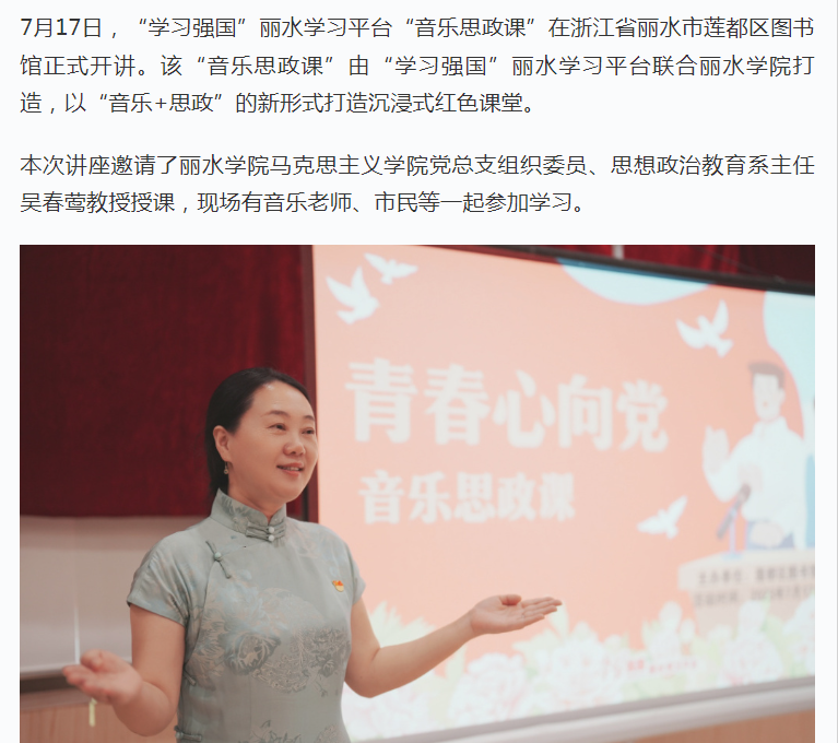 7月21日,“学习强国”浙江学习平台刊发了由我校与丽水学习平台联合打造的“音乐思政课”开课的消息。