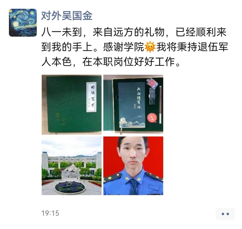 校友们在收到“八一”慰问纪念品时,纷纷通过朋友圈、留言的方式表达了对母校的感谢,溢于言表的开心和感动,并表示在各自的岗位上秉持退伍军人本色,爱岗敬业、奉献社会。