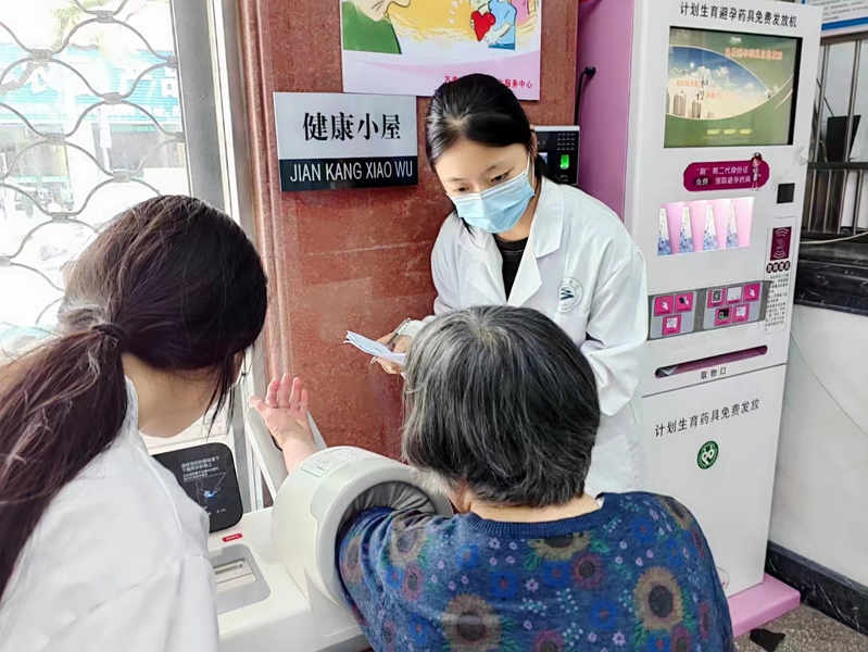 在灯塔社区,团队成员首先为老年人测量血压,通过测量血压,让老人们了解自身健康状况,及时调整生活方式、饮食习惯以及必要的药物治疗,有助于预防并控制慢性疾病的发展。根据测量结果,团队成员还对老年人进行健康宣教,叮嘱市民减少钠盐摄入、增加钾摄入、控制体重、加强锻炼等。