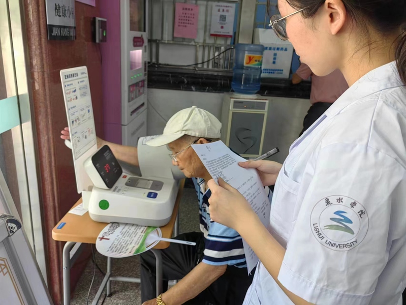 为响应“十四五”健康老龄化规划,提高老年人对高血压的认识,近日,医学院“心佑血管之树,助力老年健康——社区老年心血管疾病患者BPV”调研实践团队走进白云街道灯塔社区和万象社区卫生服务中心,为300余位社区老年人提供血压测量服务,同时为高血压老年人进行高血压知识科普以及健康生活方式宣教。