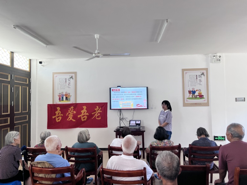 实践团队来到了新碧街道居家养老服务中心,开展“老年课堂”活动。养生课堂上,团队成员从夏季气候特点出发,用通俗易懂的语言,针对老年人夏季容易出现的问题以及如何预防疾病等各个方面进行了讲解。不仅如此,成员们还为老人们呈现了一场精彩纷呈的防诈骗课堂。学生们结合真实案例,详细讲解有关电话欠费、短信中奖、冒充公检法等诈骗手法以及解决办法,帮助老人们守牢“钱袋子”。