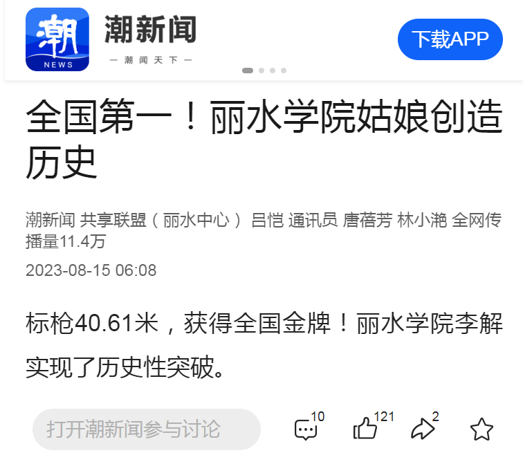 8月15日,潮新闻客户端刊发了我校医学院李解同学获得第二十一届全国大学生田径锦标赛女子甲组标枪金牌的消息。