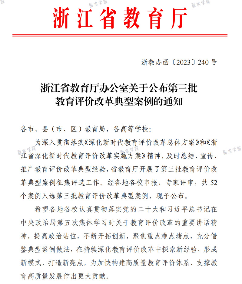 8月24日,浙江省教育厅办公室公布了第三批教育评价改革典型案例,由我校党委学工部、学生处报送的《“红色指数”激活“红色基因” 构建新时代大学生党员教育发展评价体系》入选为浙江省第三批教育评价改革典型案例,全省入选名单共计52项。