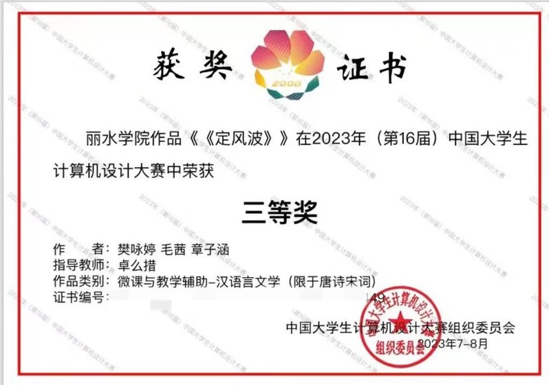 日前,由中国大学生计算机设计大赛组织委员会主办的第十六届中国大学生计算机设计大赛圆满落幕,我校教师教育学院樊咏婷、毛茜、章子涵创作的微课作品《定风波》(指导老师:卓么措)荣获国赛三等奖。
