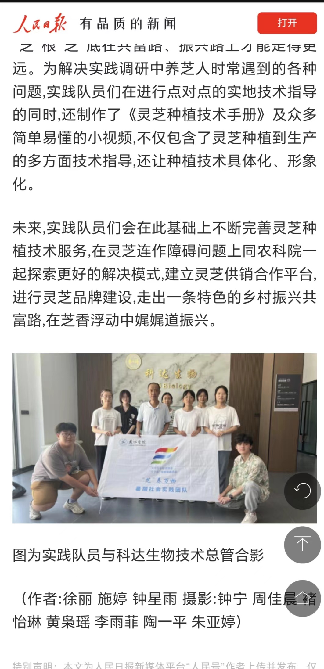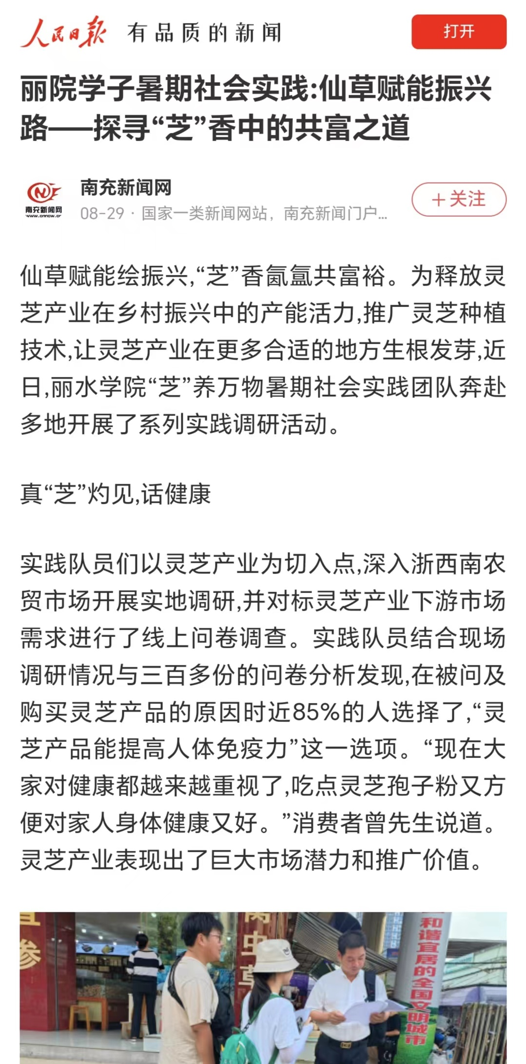 8月29日,人民日报客户端南充新闻网报道了我校生态学院“芝”养万物团队三下乡暑期社会实践活动相关消息。