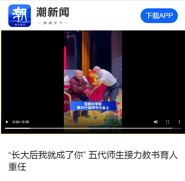 9月10日,潮新闻客户端刊发了我校举行庆祝教师节大会的消息。“长大后我就成了你” 五代师生接力献花环节让现场动容。