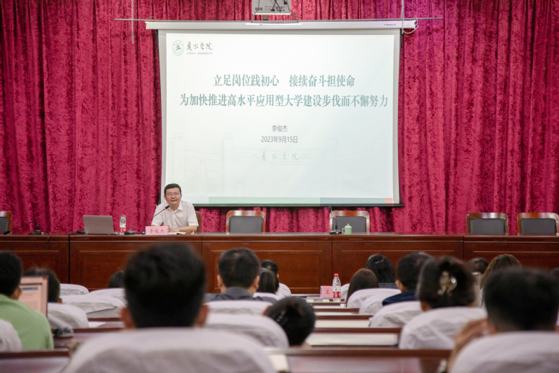 9月15日上午,我校在思齐楼一楼报告厅举行了2023年新进教师入职培训开班仪式,校长李俊杰以《立足岗位践初心,接续奋斗担使命,为加快推进高水平应用型大学建设步伐而不懈努力》为题为全体新入职教师讲授了第一课。