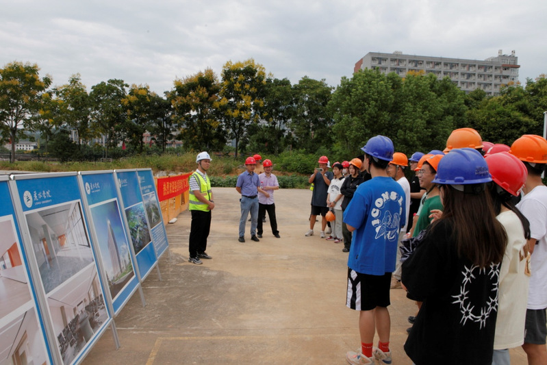 “欢迎同学们来到自家工地参观学习”的横幅在学校在建工地上高高挂起,日前,在校园建设管理处的大力支持下,工学院将始业教育的第一课搬到了学校在建项目工地上。