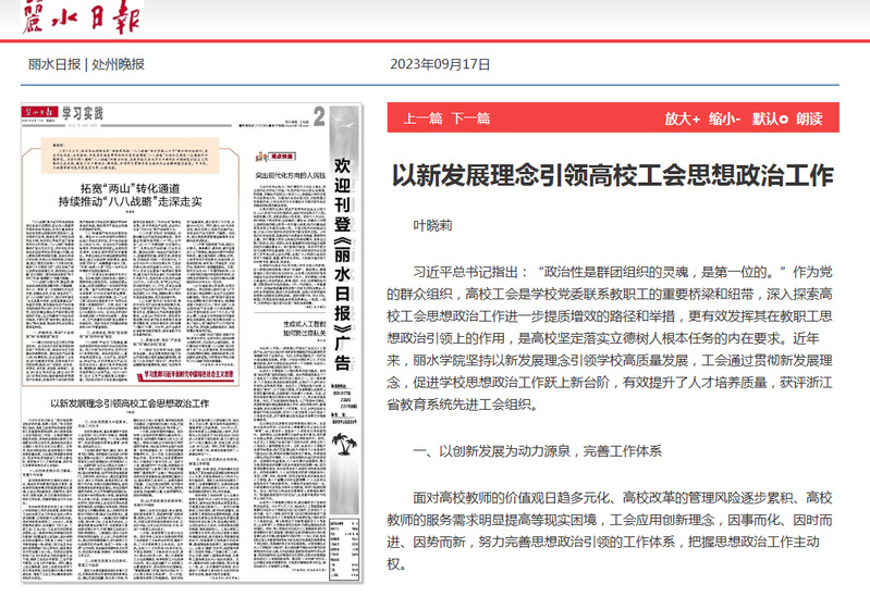 9月17日,丽水日报刊发了我校叶晓莉老师的署名文章《以新发展理念引领高校工会思想政治工作》。