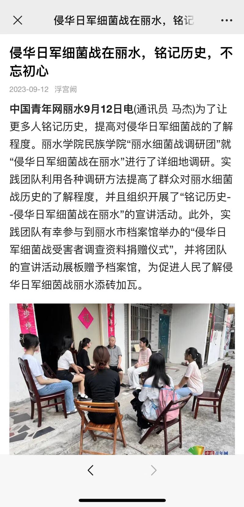 9月12日,中国青年网刊发了丽水学院民族学院暑期社会实践团队“侵华日军细菌战在丽水,铭记历史,不忘初心”的消息。