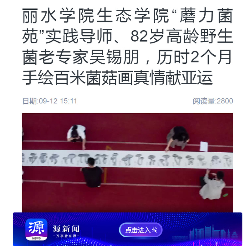 9月12日,源新闻客户端刊发了我校生态学院“蘑力菌苑”实践导师、82岁高龄野生菌老专家吴锡朋,历时2个月手绘百米菌菇画真情献亚运的消息。