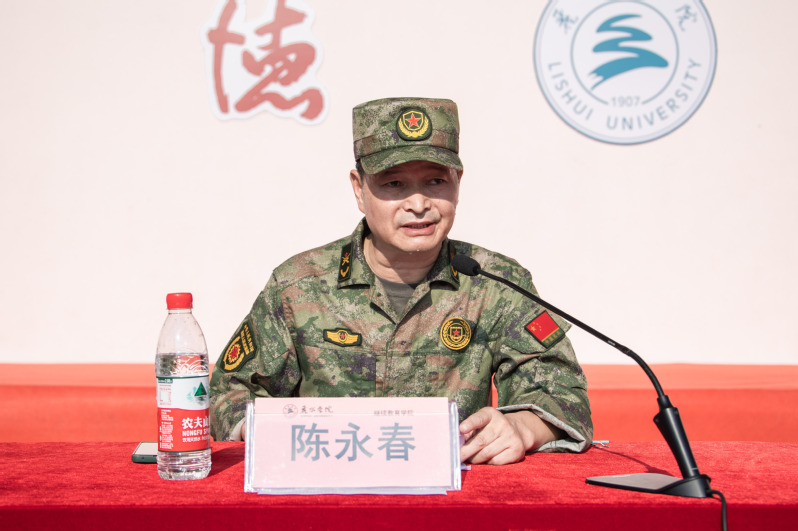 陈永春代表莲都区人武部所有参训教官,向高度重视国防教育的学院领导、老师表示衷心的感谢。他向全体参训新生和教官提出四点要求:一是提高认识,端正态度,始终以一个军人的标准严格要求自己;二是遵守纪律,听从指挥,军训期间要像军人一样增强组织纪律观念,形成良好的行为习惯;三是专心听讲,领会要领,练出风格,练出水平,练出意志;四是精心施教,严格管理,要求教官们科学训练,因人施教,安全施教,发挥军人的优良传统,做文明之师的传播者。