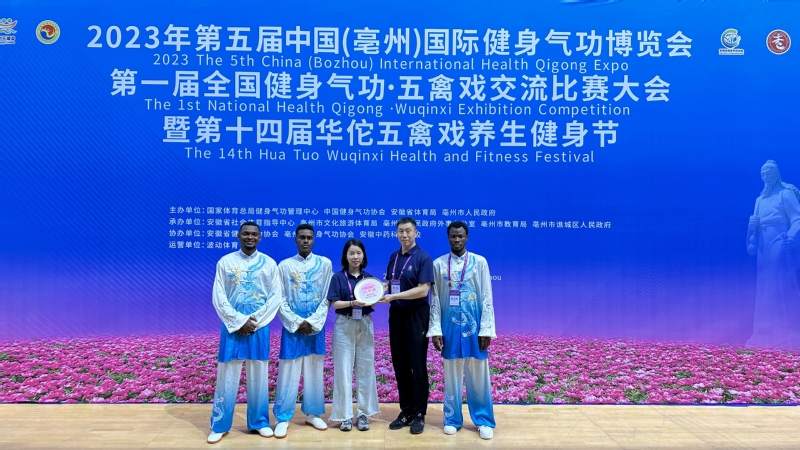 日前,2023年第五届中国国际健身气功博览会暨第一届全国健身气功·五禽戏交流比赛大会在安徽亳州举行,共有来自中国、俄罗斯、阿根廷、匈牙利、印度等18个国家的36支代表队参与。我校留学生首次组队参赛,并获得八段锦个人赛二等奖2项、五禽戏个人赛三等奖1项,八段锦集体赛三等奖1项、五禽戏集体赛三等奖1项。