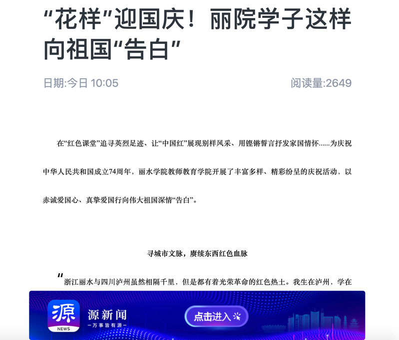 10月7日,源新闻客户端刊发了丽水学院教师教育学院学子“花样”迎国庆,向祖国“告白”的消息。