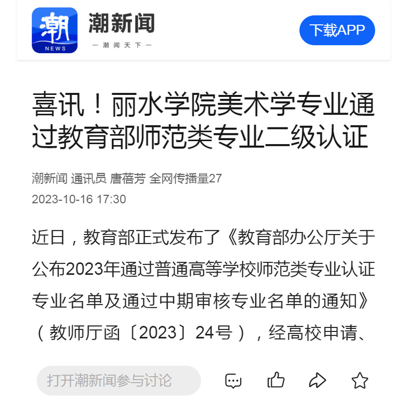 10月16日,潮新闻客户端刊发了我校美术学专业通过教育部师范类专业二级认证的消息。