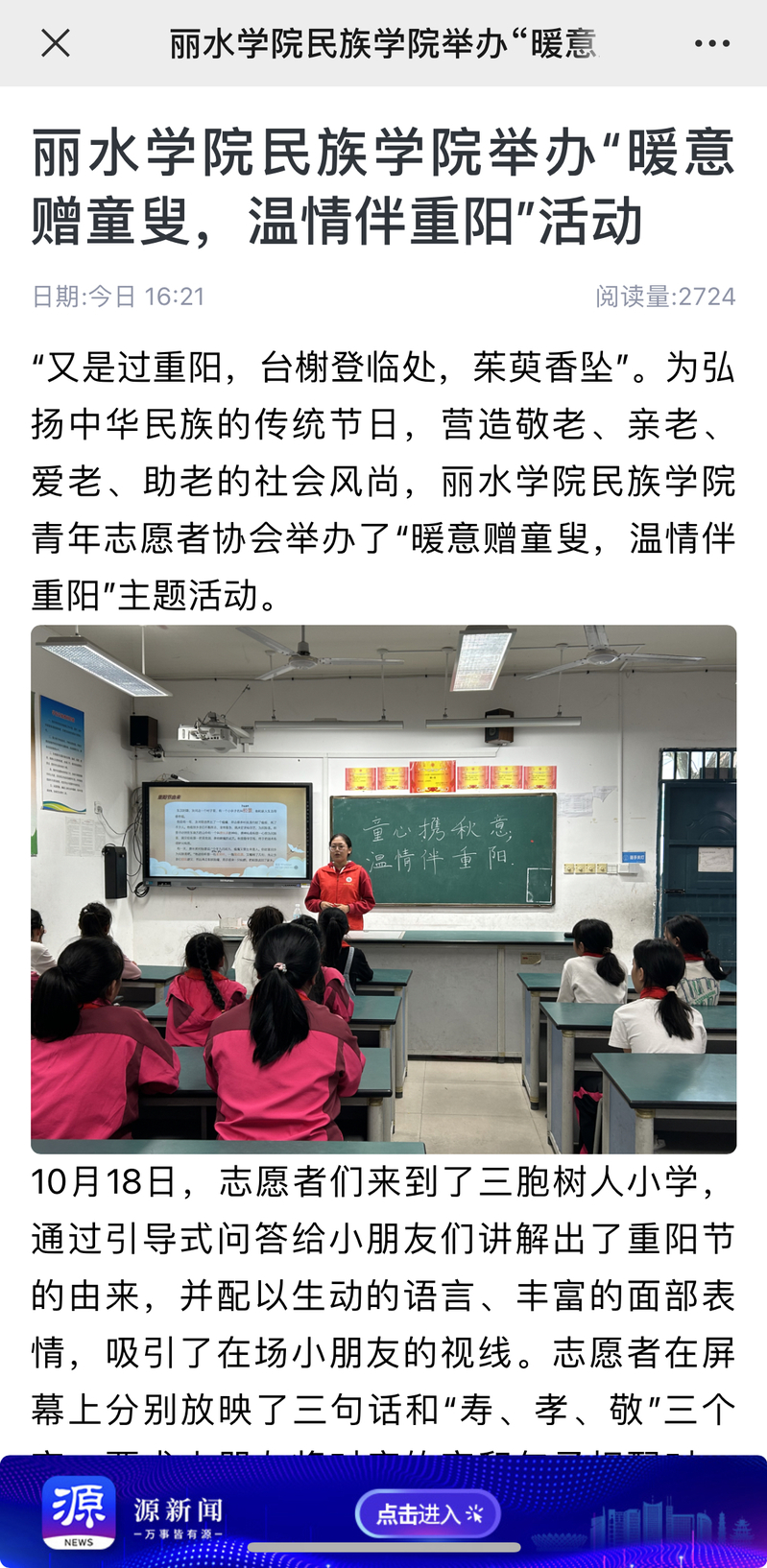 10月23日,源新闻客户端刊发了丽水学院民族学院举办“暖意赠童叟,温情伴重阳”活动的相关信息。