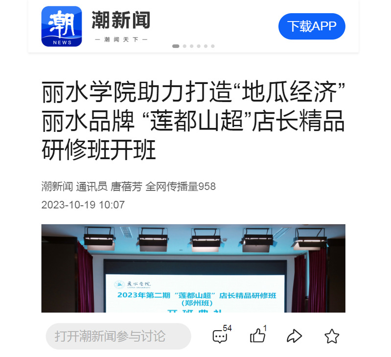 10月19日,潮新闻客户端刊发了我校助力打造“地瓜经济”丽水品牌 “莲都山超”店长精品研修班开班的消息。