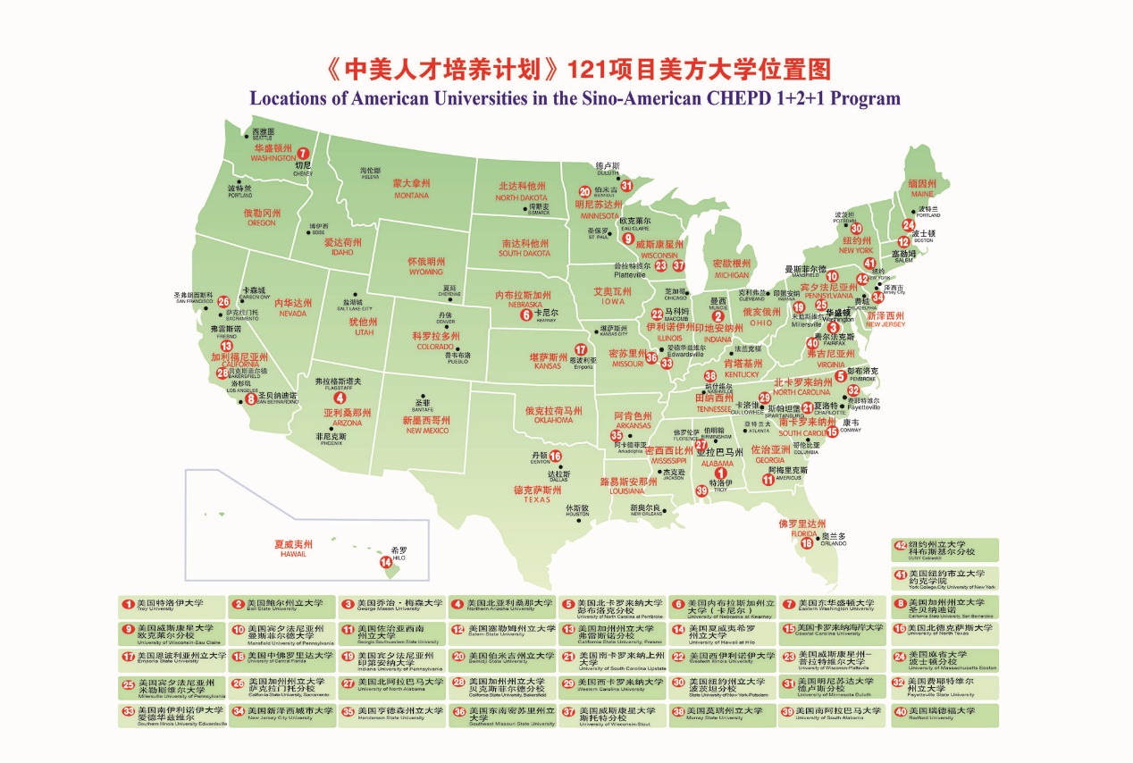 《中美人才培养计划》121项目是教育部所属中国教育国际交流协会(CEAIE)、中教国际教育交流中心(CCIEE)和美国州立大学与学院协会(AASCU)共同管理的新型中美高等教育双向交流与合作项目。项目旨在通过创新人才培养模式,培养国际创新型人才,已成为目前中美高校参与最多、合作与交流领域最为广泛的中美高等教育合作与交流平台。截至到2023年10月,共有190所中美大学加入该项目,其中中方大学146所,美方大学44所。