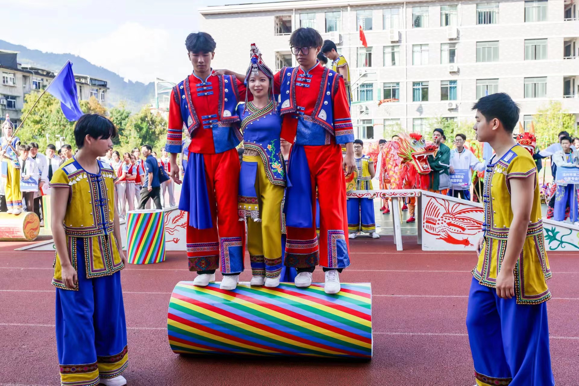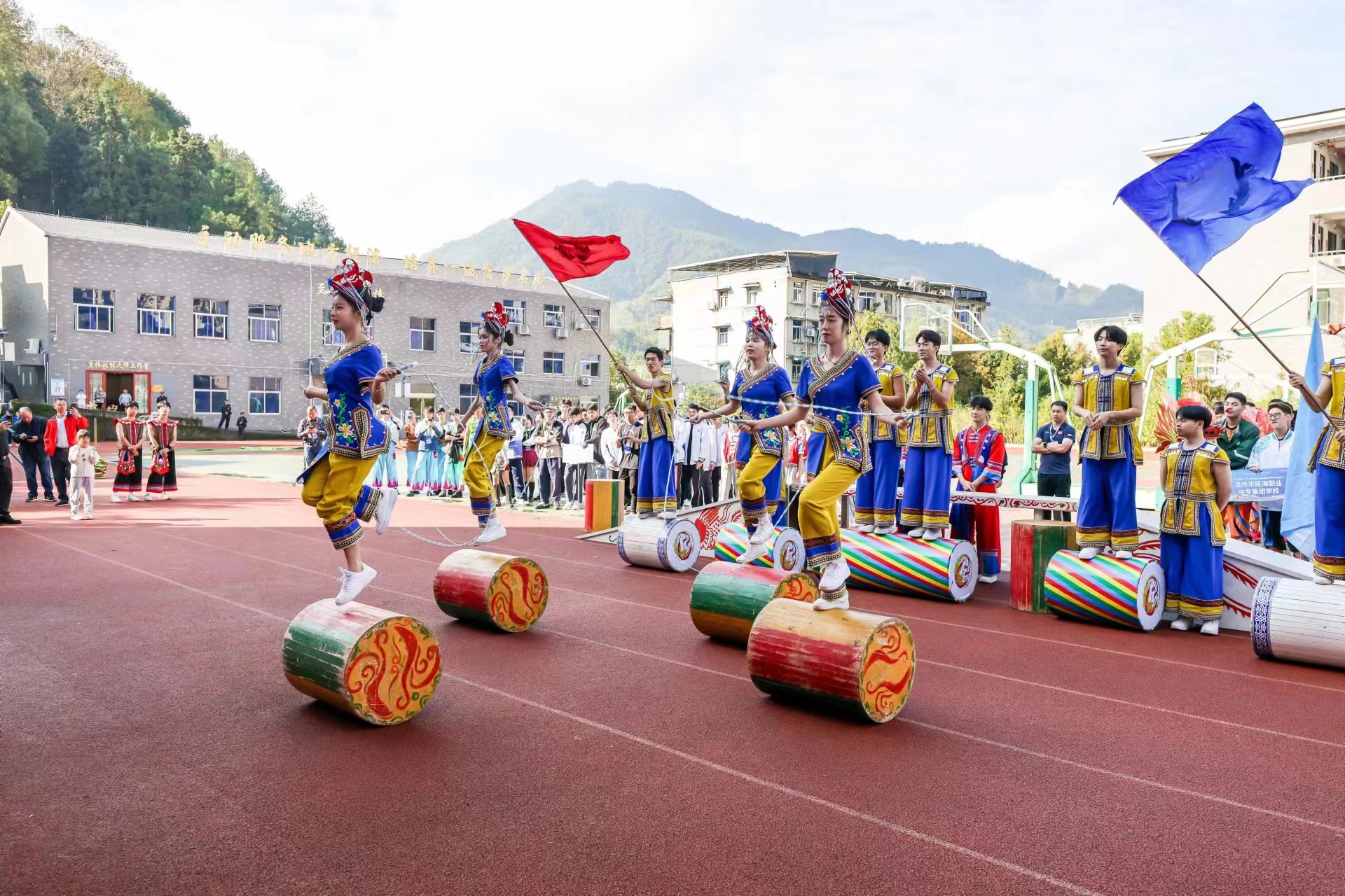 我校师生在活动中展示了蹴石磉、稳凳等畲族传统体育项目,充分展现了畲族传统体育运动的独特魅力。伴随着欢快的音乐,同学们踩着节拍跳上石磉,并在石磉上展示各项技能,赢得了现场阵阵喝彩声;在飞速旋转的稳凳上,同学们矫健的身姿,精准的套圈表演,将现场氛围再次推向高潮。