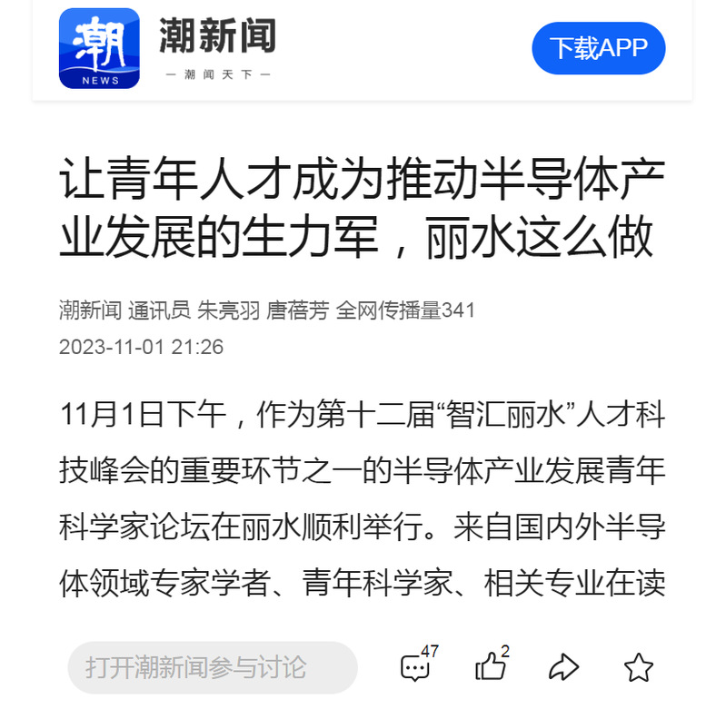 11月1日,潮新闻客户端刊发了我校举办半导体产业发展青年科学家论坛的消息。