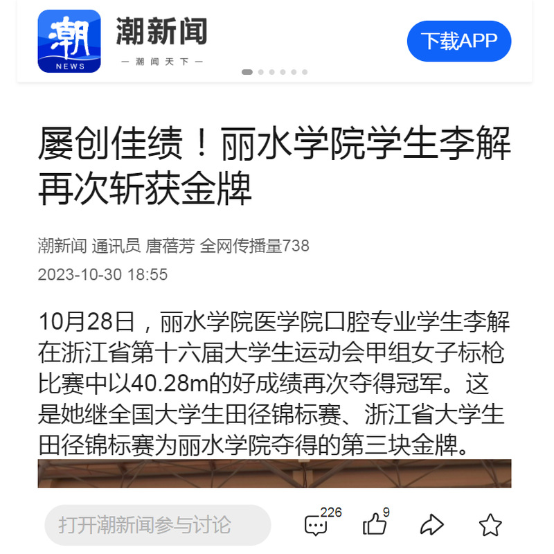 10月30日,潮新闻客户端刊发了我校李解同学斩获浙江省第十六届大学生运动会甲组女子标枪冠军的消息。