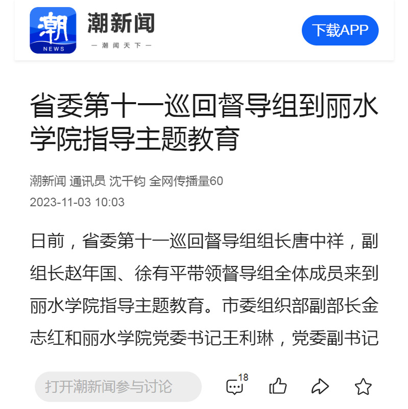 11月3日,潮新闻客户端刊发了省委第十一巡回督导组到我校指导主题教育的消息。