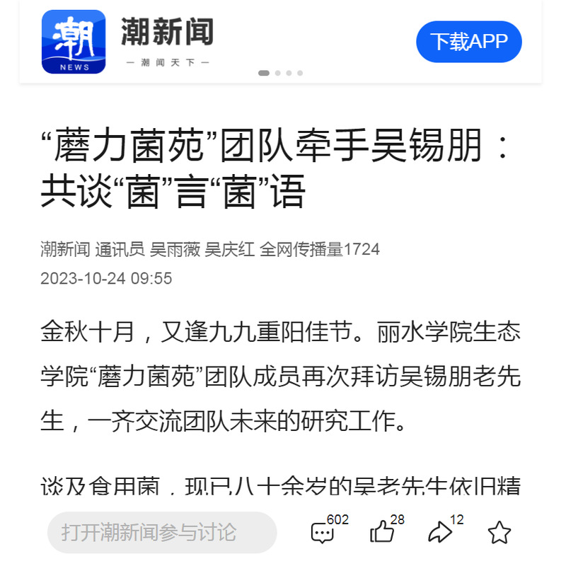 10月24日,潮新闻客户端刊发了重阳节来临之际我校生态学院“蘑力菌苑”团队成员再次拜访吴锡朋老先生的消息。