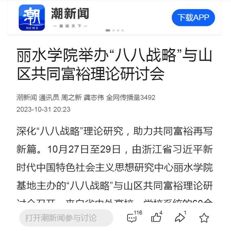 10月31日,潮新闻客户端刊发了我校举行“八八战略”与山区共同富裕理论研讨会的消息。