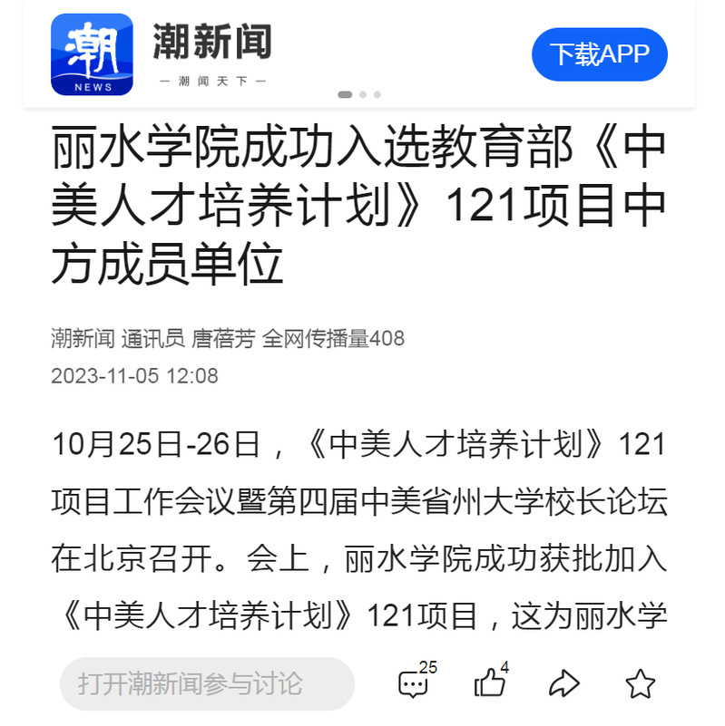 11月5日,潮新闻客户端刊发了我校成功入选教育部《中美人才培养计划》121项目中方成员单位的消息。