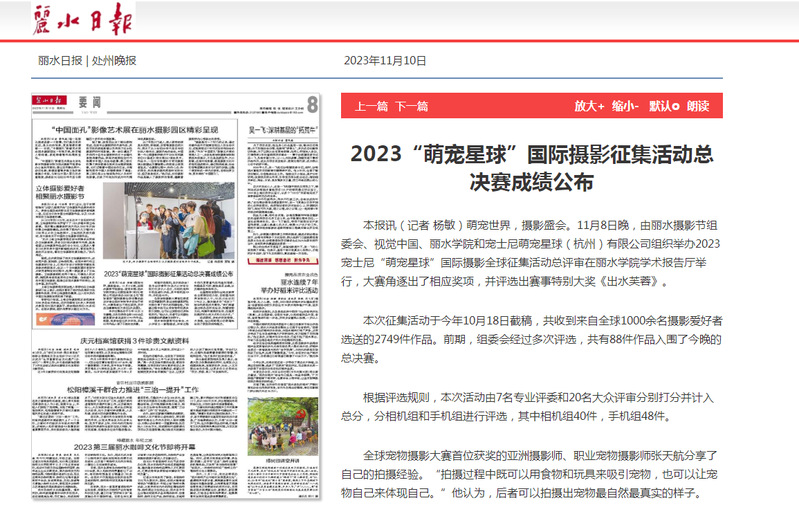 11月10日,丽水日报刊发了2023“萌宠星球”国际摄影征集活动总决赛在我校举行的消息。